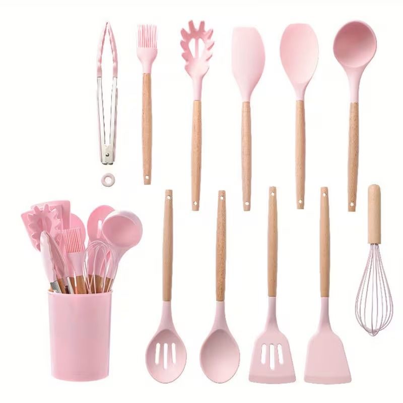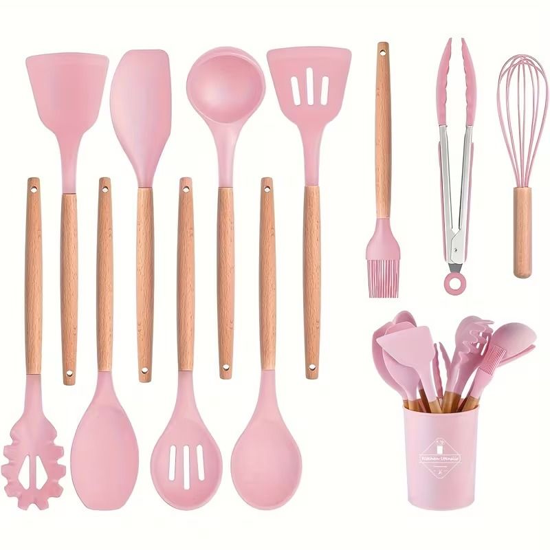 The pink silicone and wooden handles add a touch of style. This utensil set is a must-have for any kitchen. It simplifies cooking and baking tasks. Perfect for everyday use and special occasions.
