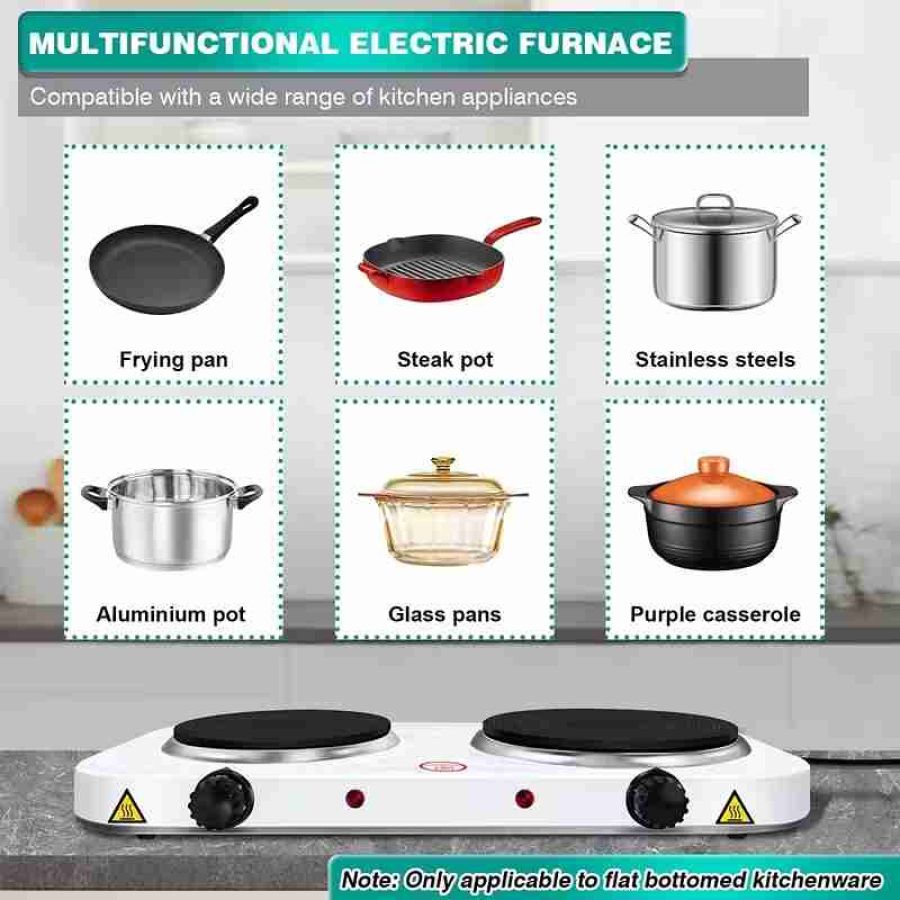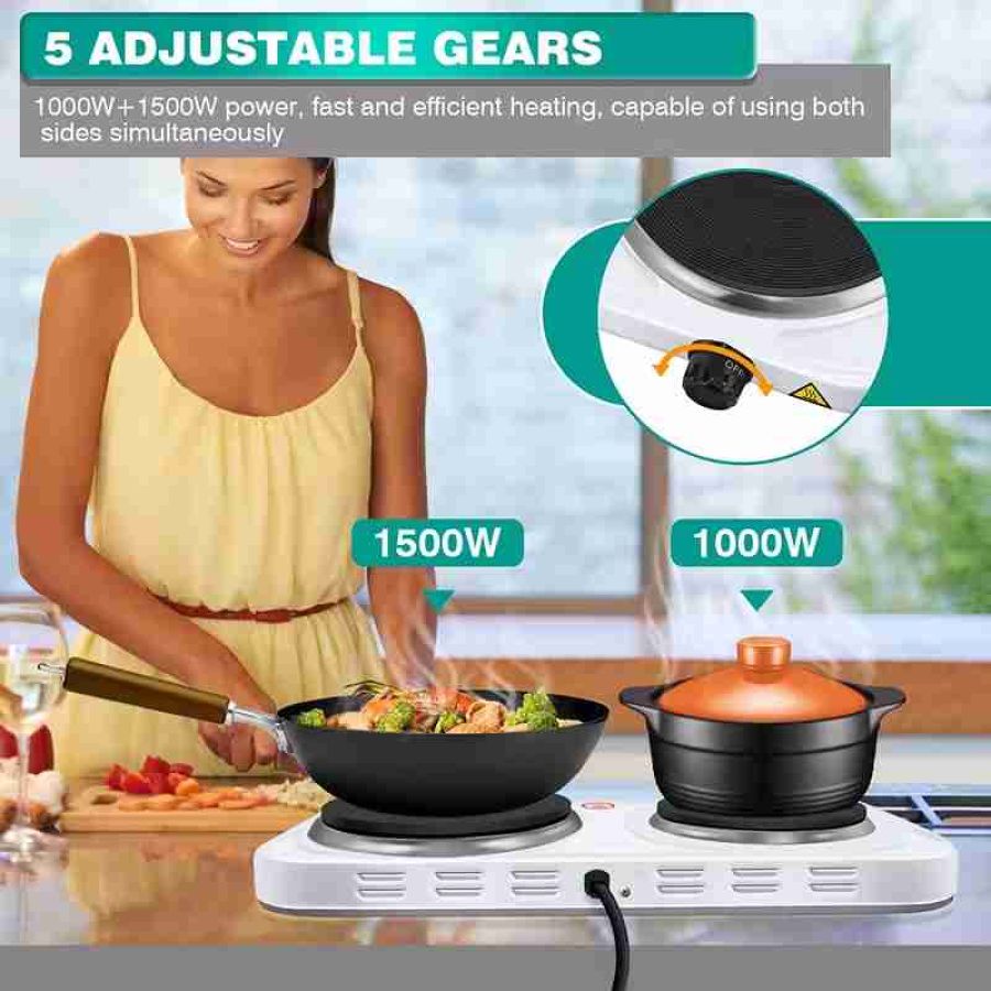 - Specifications:Power: 1500W.Material: Stainless steel.Features: Double hotplate, temperature control, double boiling ring.