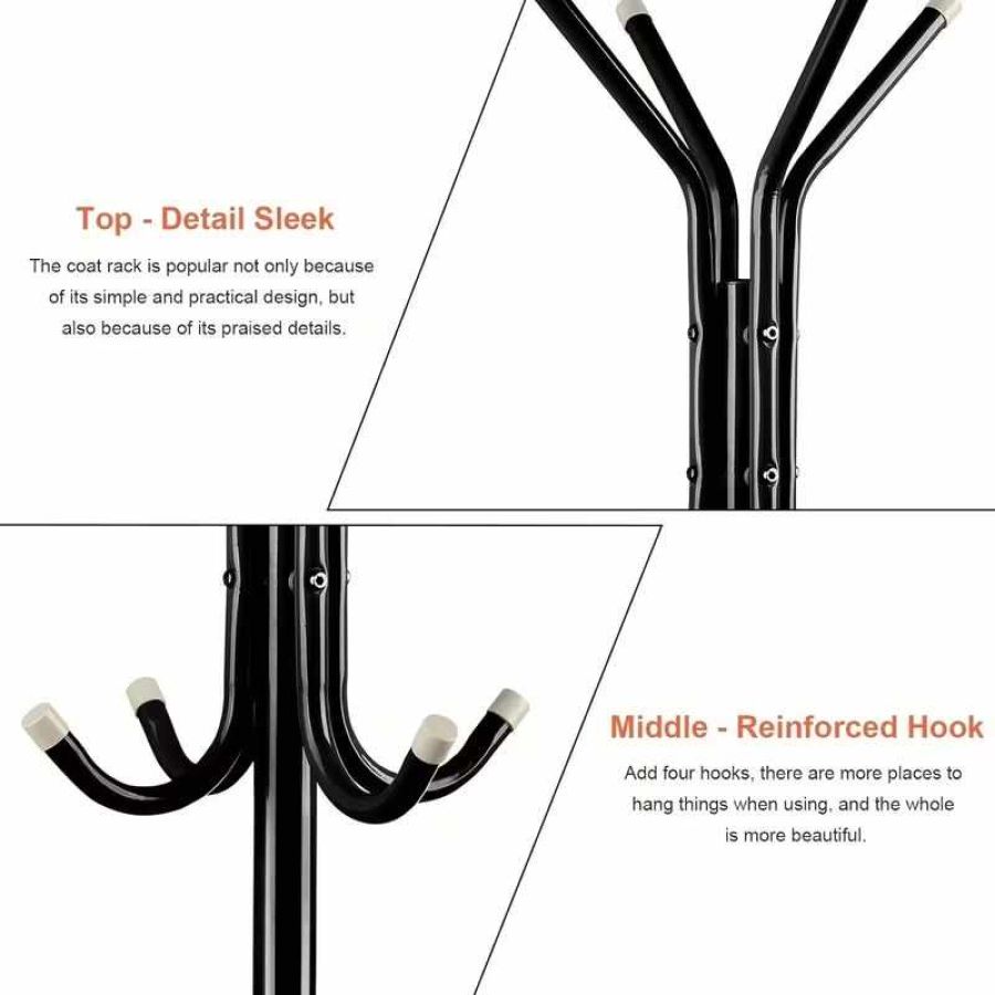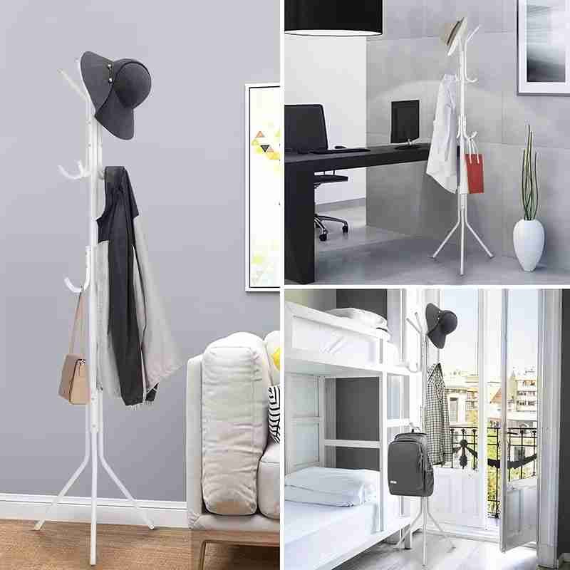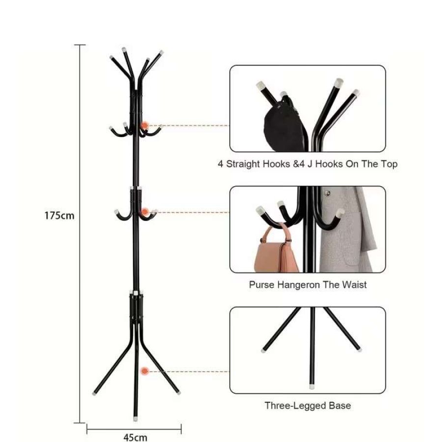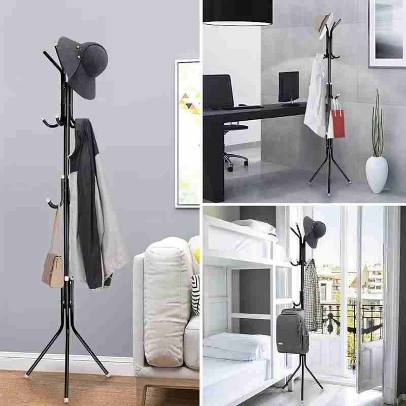 The Coat Rack Stand is a versatile metal hanger with 12 hooks. It serves as a clothes rack, 3-tier freestanding storage holder. Perfect for homes, offices, entryways, and hallways, this organizer hangs hats, handbags, jackets, and umbrellas. The black finish adds a sleek touch to any space.