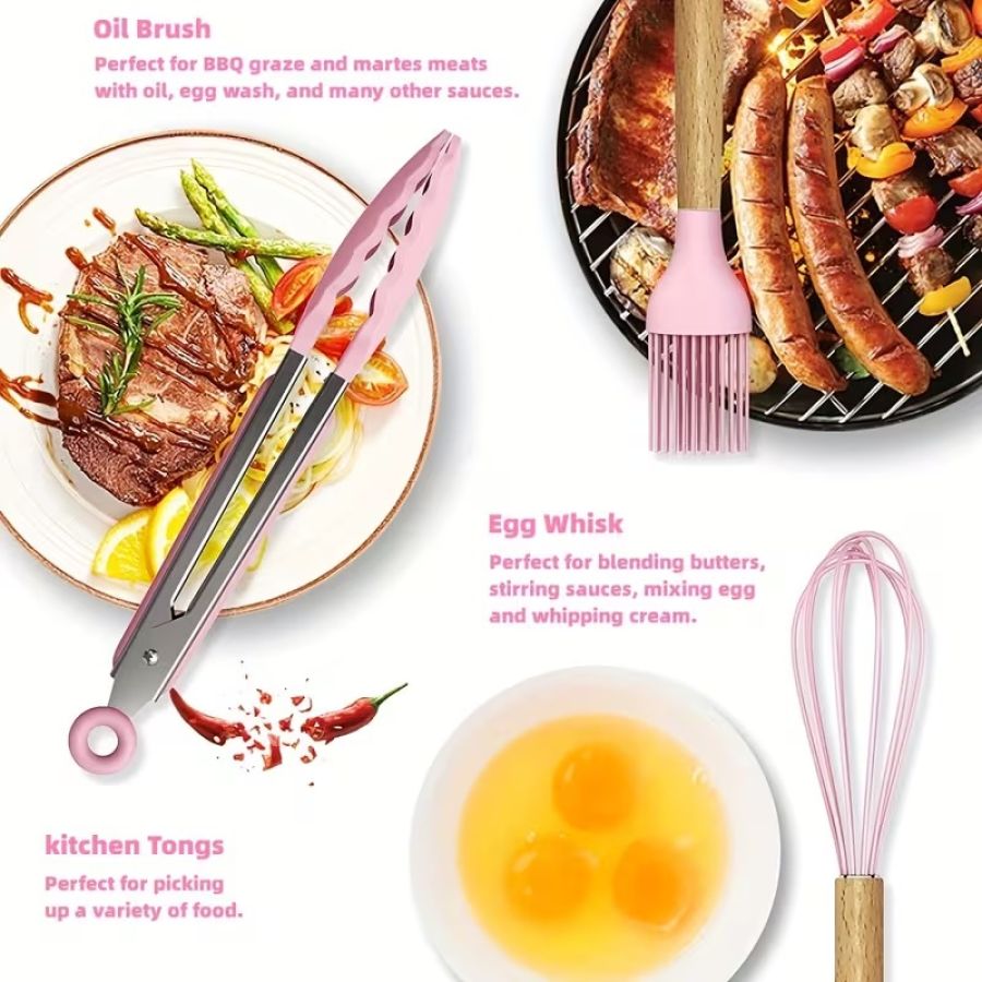 The pink silicone and wooden handles add a touch of style. This utensil set is a must-have for any kitchen. It simplifies cooking and baking tasks. Perfect for everyday use and special occasions.